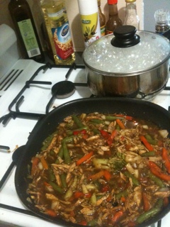 I had been subsisting off a cooked chook I bought on Wednesday for sandwiches (3 days worth of sandwiches in fact, I had another one today) but last night it went in a honey and soy stir fry… and it was good.
