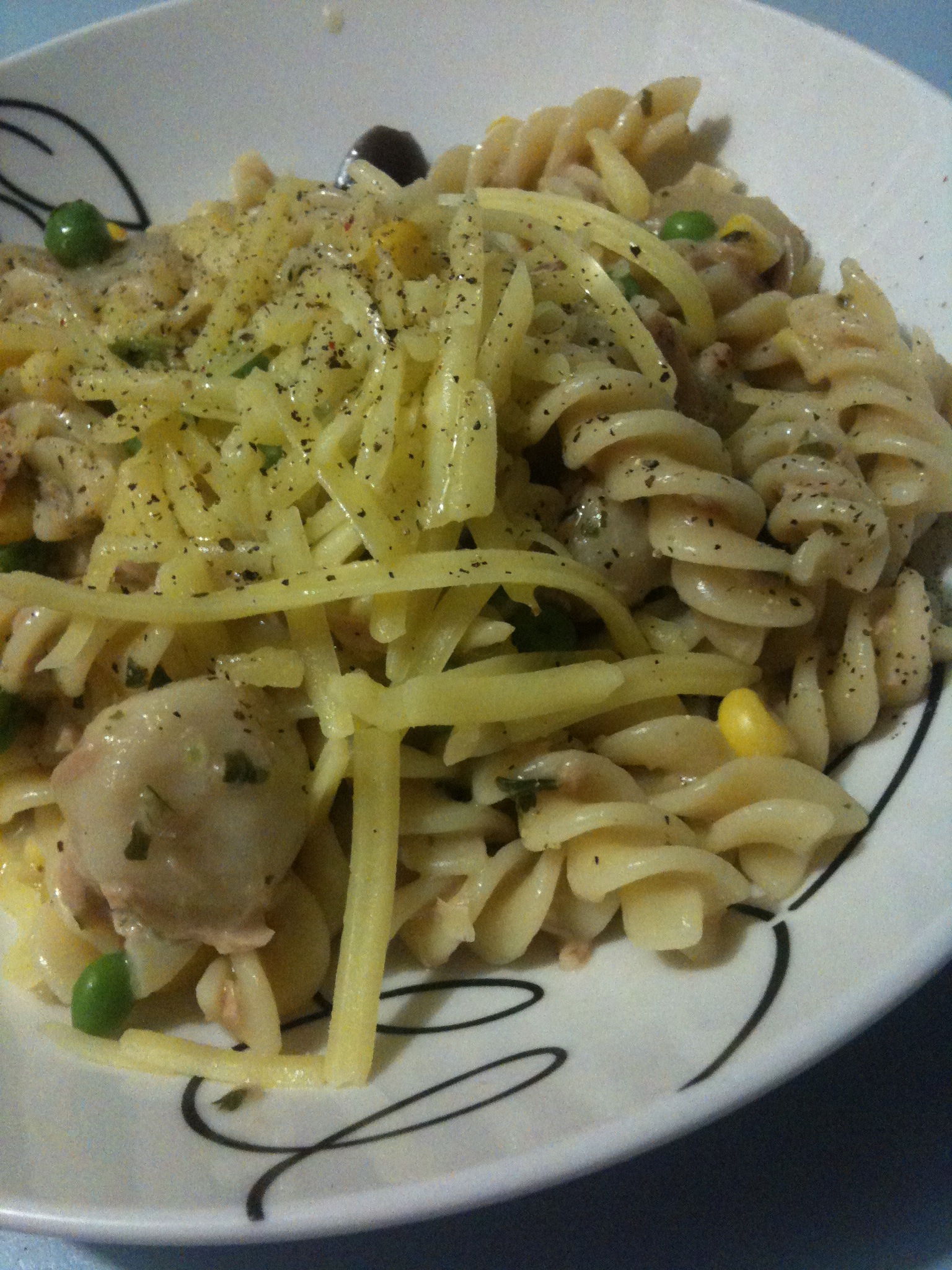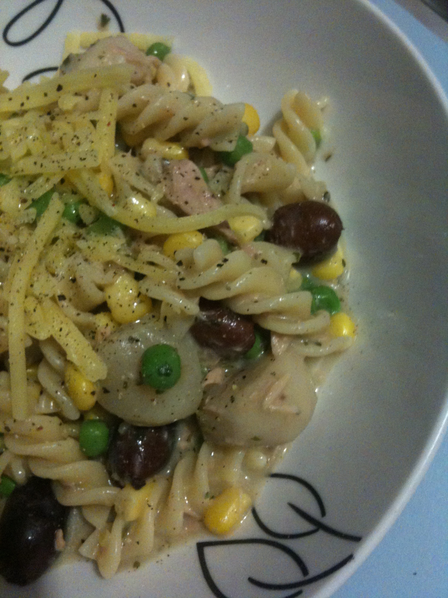 Mix that really well, I have a little whisk which makes it easier. Add it to the pasta salad, sprinkle some cheese on top and bob’s your aunty.
