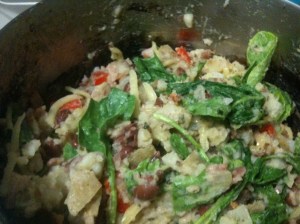 The last step should be the spinach – the heat of the potatos usually wilts it just enough.