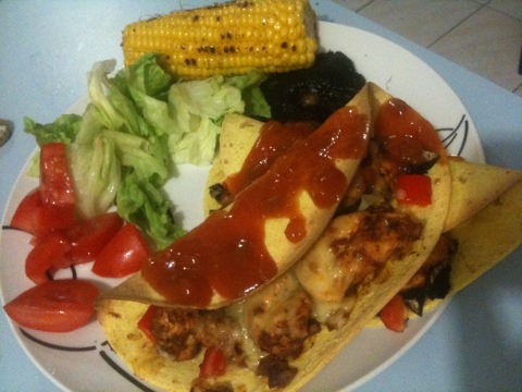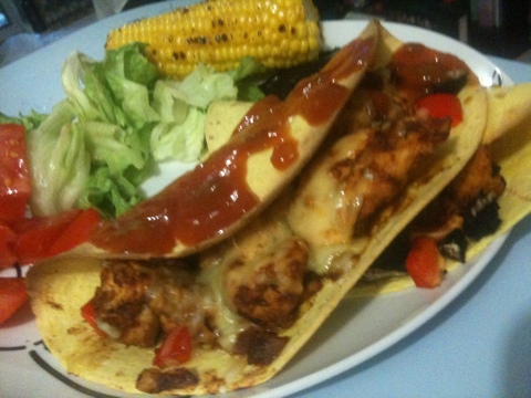 So i felt it was only fair to cook him dinner. And all day i’ve been craving mexican food so i bought one of those Chicken Quesidila packs. They have the corn burrito, salsa, and chicken seasoning all in the pack. All you have to do is cook the chicken with the onion, add capsicum and mushroom, put it in the burrito and then top with cheese and fold over. Bung it in the oven until the cheese melts (and the corn cobs cook).