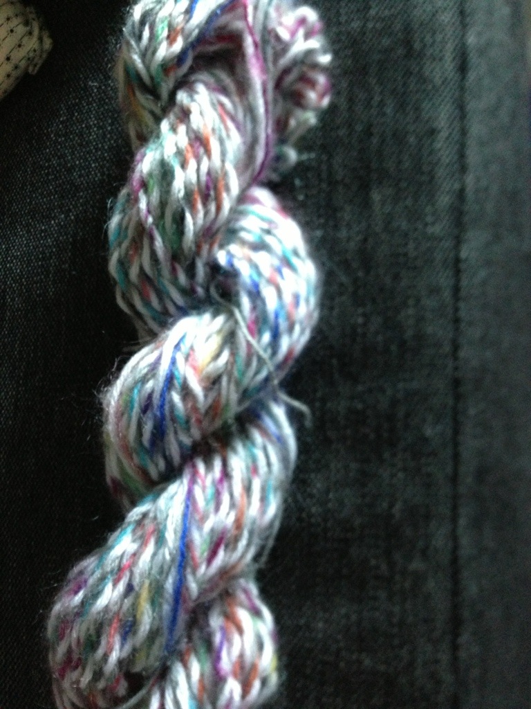 I plied a white dk weight, a grey sock weight, and a multi coloured fingering weight together.