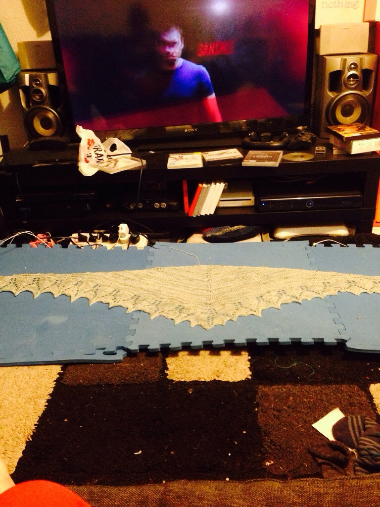 It took at least an hour to pin it all out. But I’ve finally witnessed the magic of blocking. The process of something coming off the needles, not really looking like anything, but then transformed by a spray of water and some time.