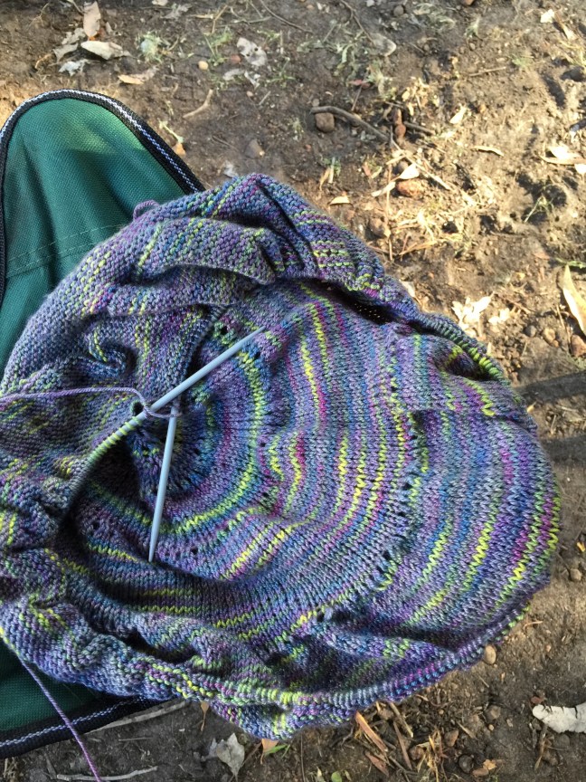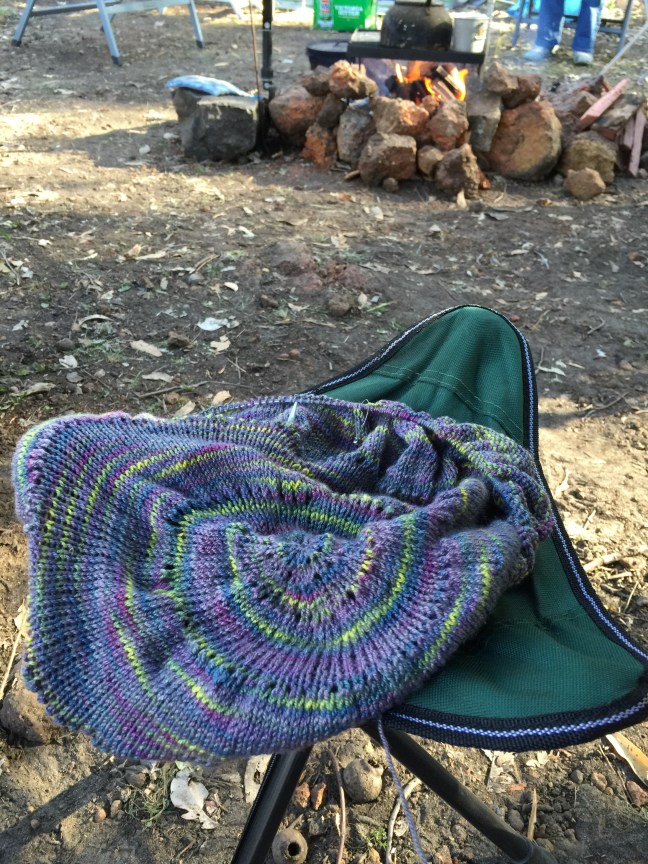 Elizabeth Zimmerman’s Pi shawl has all the stockinette a camper could ask for. The chapter of the Knitters Almanac with the Pi Shawl recipe has an entire section on camping knitting which put me right in the mood. I have since bought a hard copy of the book, but I found the pattern in an online preview which I print screened and took along with me.