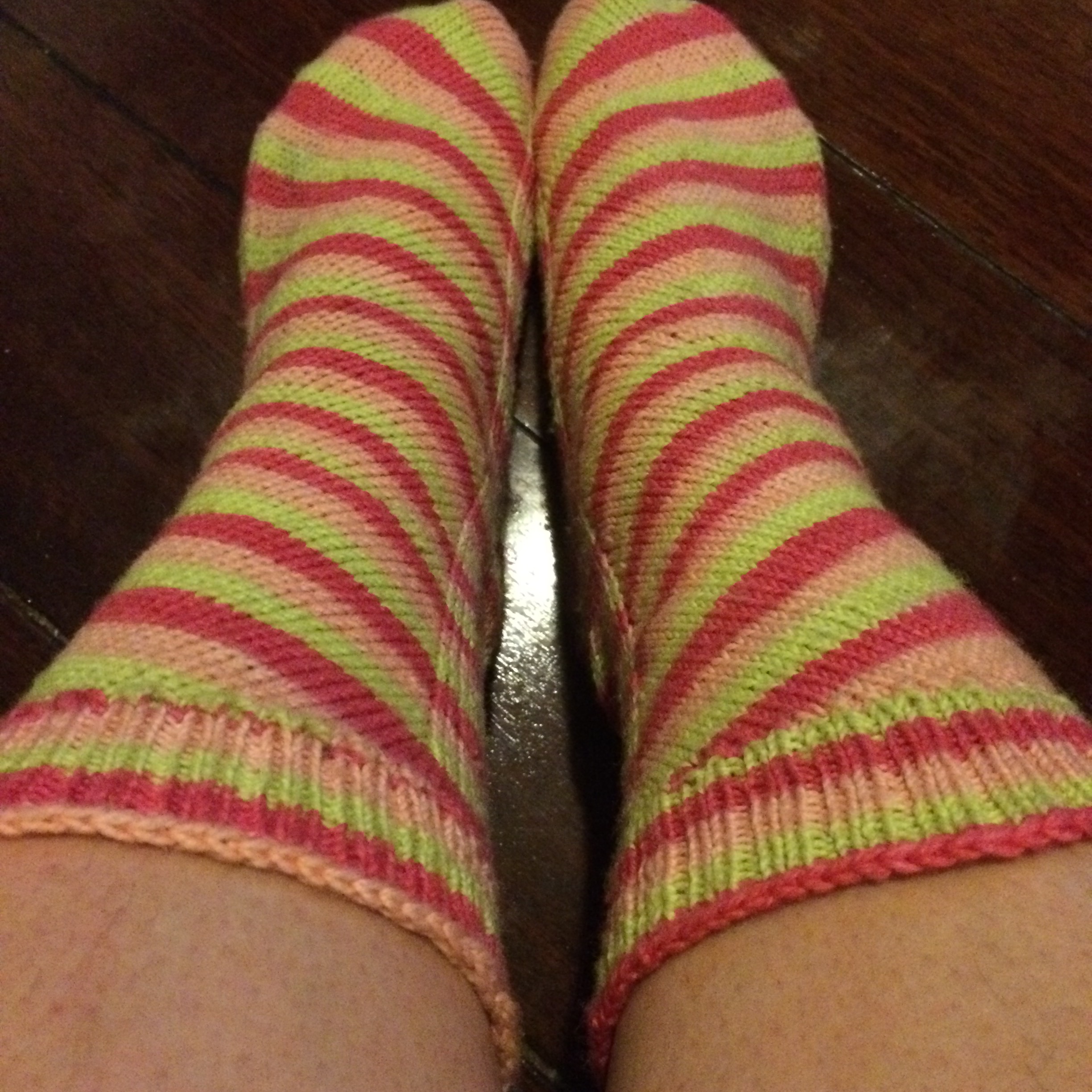 They’re made with Knit Picks Felici which I admit that I LURVE knitting with. Compared with Moda Vera’s sock yarn which was my previous go-to (non-indie dyed) sock yarn it is an absolute delight. The self striping colour ways are lovely and the merino/nylon blend is so soft and squishy.