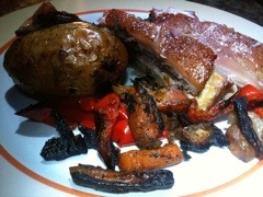 After 2 hours the pork was cooked, the crackling was crunchy, and the vegies were at that glorious stage of caramelised golden brown.