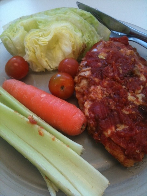 The tomato mixture was 1 tin of tomatoes, some chopped Italian sausage, a grated carrot, some red wine, and more salt and pepper.